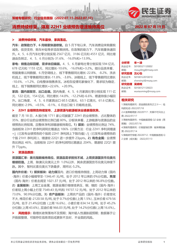 【民生证券】【20220719】策略专题研究:行业信息跟踪,消费持续修复,煤炭22H1业绩预告增速维持高位-27页