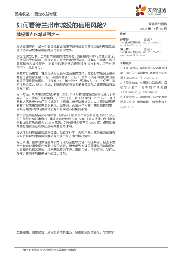 【天风证券】【20220719】城投重点区域系列之三:如何看待兰州市城投的信用风险?-23页
