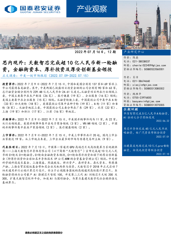 【国泰君安证券】【20220716】产业观察12期:思内观外,天数智芯完成超10亿人民币新一轮融资,金融街资本、厚朴投资及厚安创新基金领投-27页