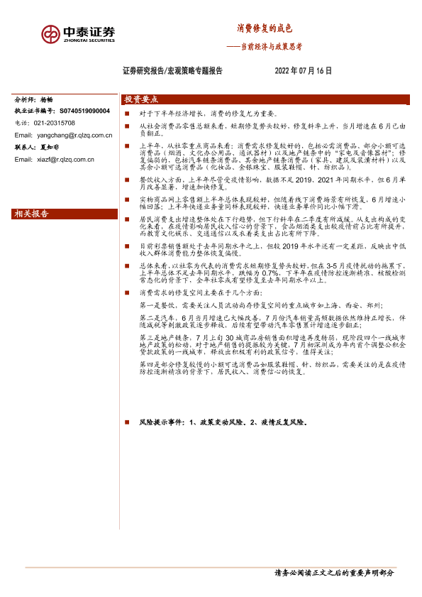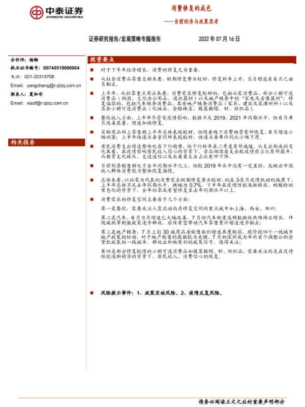 【中泰证券】【20220716】当前经济与政策思考:消费修复的成色-20页