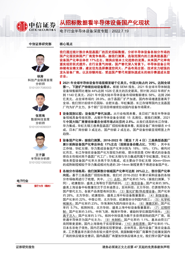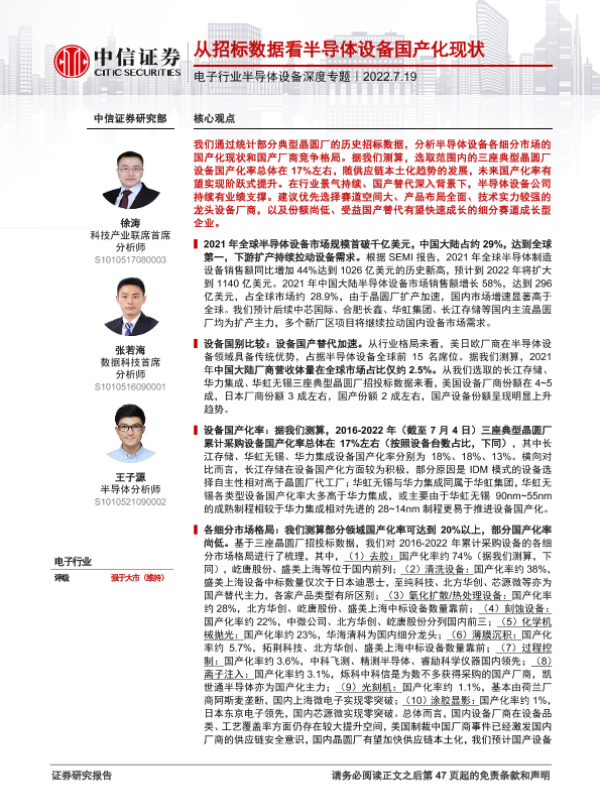 【中信证券】【20220719】电子行业半导体设备深度专题:从招标数据看半导体设备国产化现状-48页