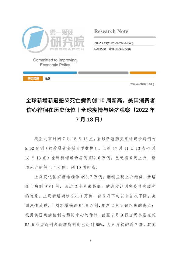 【第一财经研究院】【20220719】全球疫情与经济观察(2022年7月18日):全球新增新冠感染死亡病例创10周新高,美国消费者信心徘徊在历史低位-23页