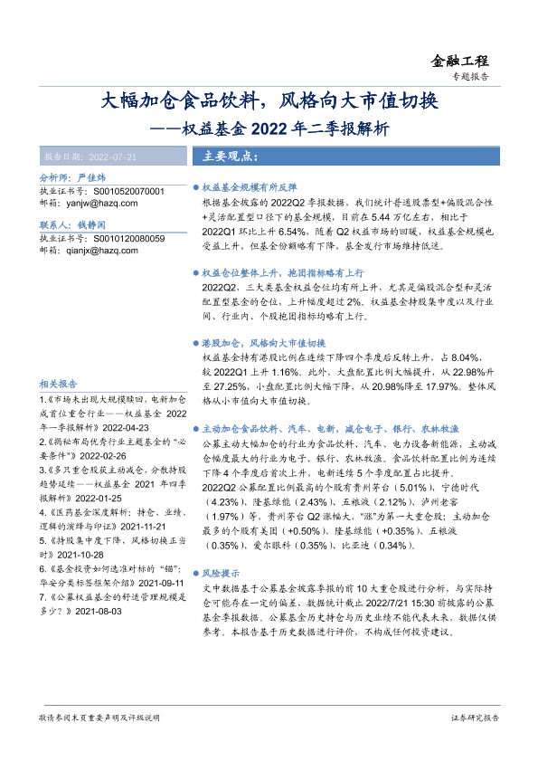 【华安证券】【20220721】权益基金2022年二季报解析:大幅加仓食品饮料,风格向大市值切换-18页