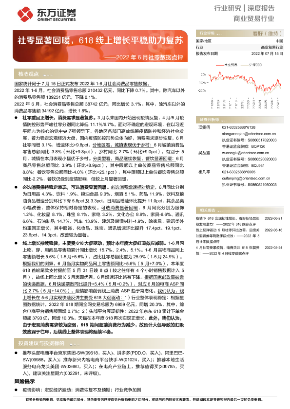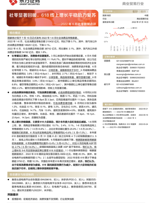 【东方证券】【20220718】商业贸易行业2022年6月社零数据点评:社零显著回暖,618线上增长平稳助力复苏-20页