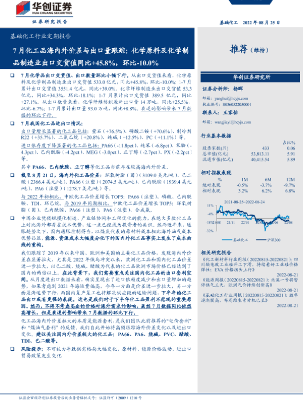 【华创证券】【20220825】7月化工品海内外价差与出口量跟踪:化学原料及化学制品制造业出口交货值同比+45.8%,环比下降10.0%-75页