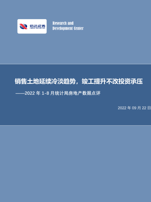 【信达证券】【20220922】2022年1_8月统计局房地产行业数据点评:销售土地延续冷淡趋势,竣工提升不改投资承压-15页