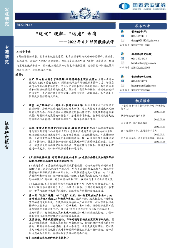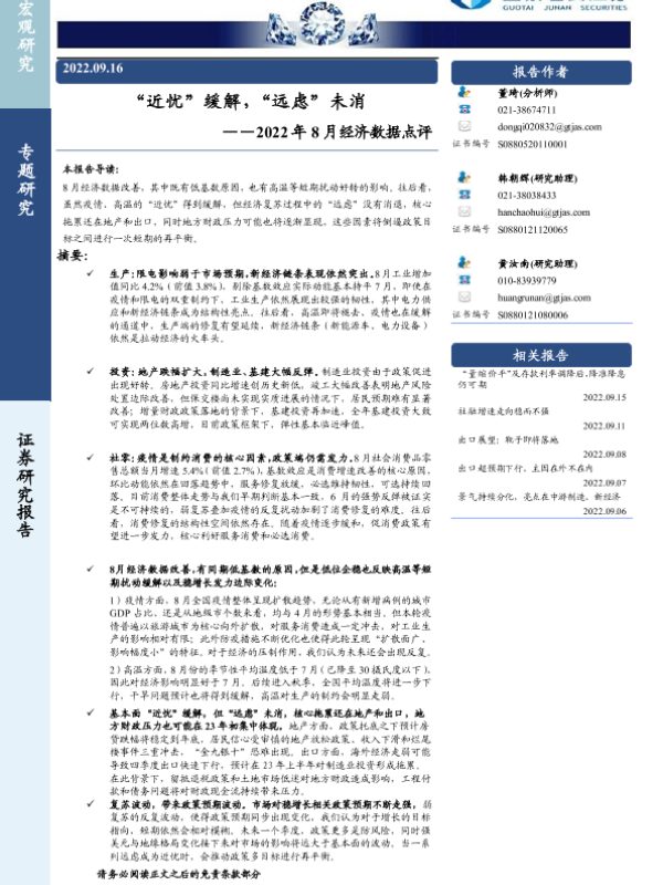 【国泰君安证券】【20220916】2022年8月经济数据点评:“近忧”缓解,“远虑”未消-18页