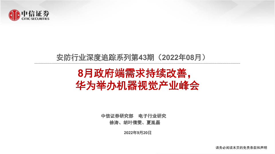 【中信证券】【20220920】安防行业深度追踪系列第43期(2022年08月):8月政府端需求持续改善,华为举办机器视觉产业峰会-20页
