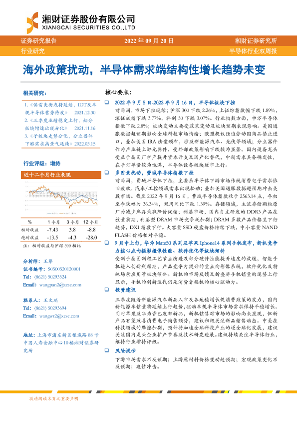 【湘财证券】【20220922】半导体行业双周报:海外政策扰动,半导体需求端结构性增长趋势未变-11页