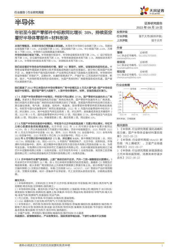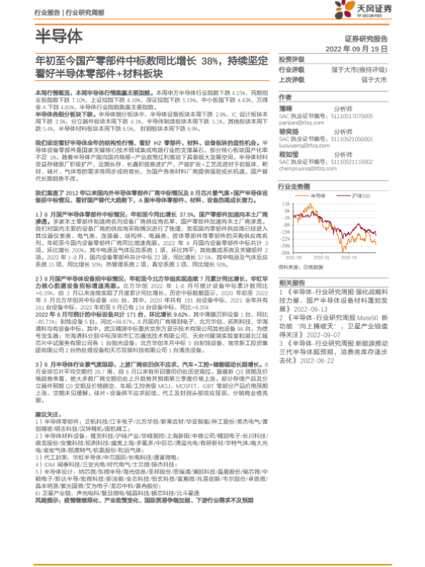 【天风证券】【20220919】半导体行业研究周报:年初至今国产零部件中标数同比增长38%,持续坚定看好半导体零部件+材料板块-23页