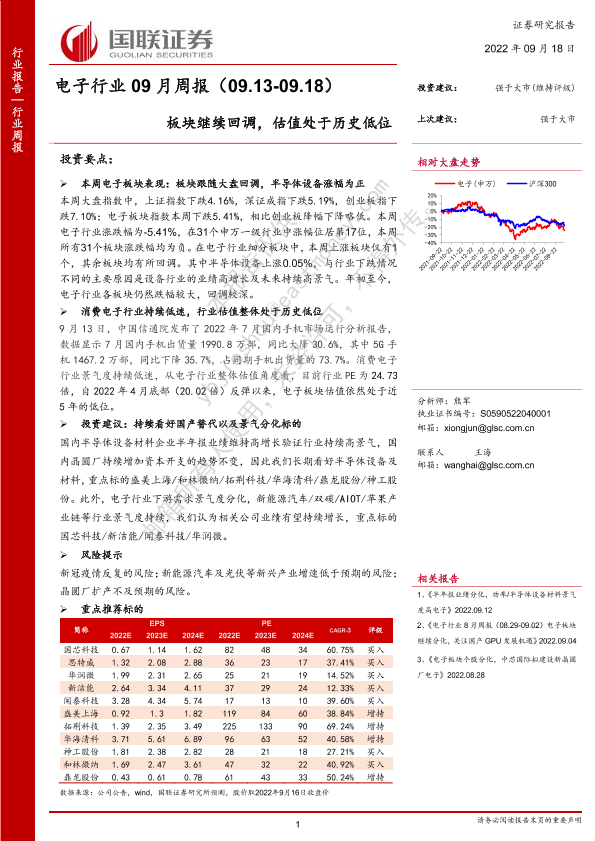 【国联证券】【20220918】电子行业09月周报:板块继续回调,估值处于历史低位-10页