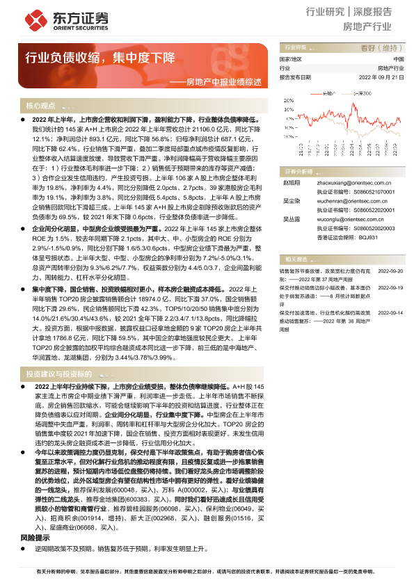 【东方证券】【20220921】房地产行业中报业绩综述:行业负债收缩,集中度下降-18页