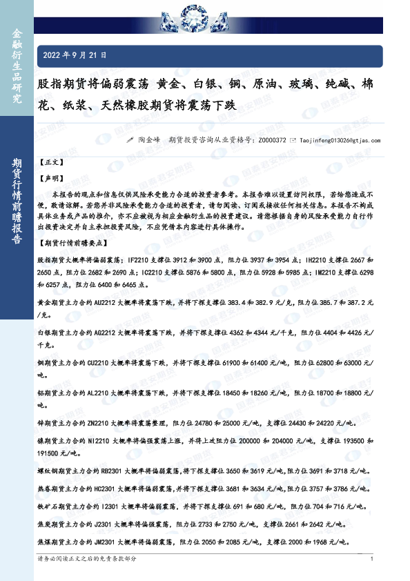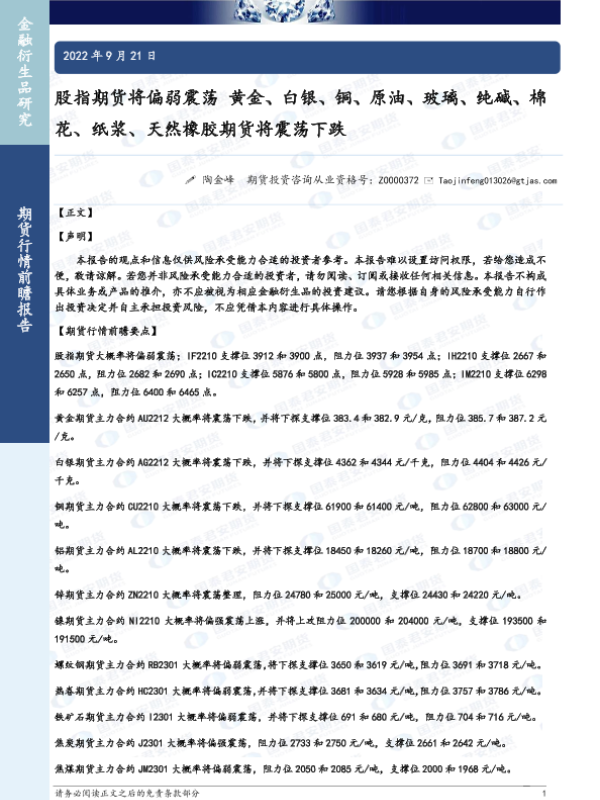 【国泰君安期货】【20220921】股指期货将偏弱震荡,黄金、白银、铜、原油、玻璃、纯碱、棉花、纸浆、天然橡胶期货将震荡下跌-39页