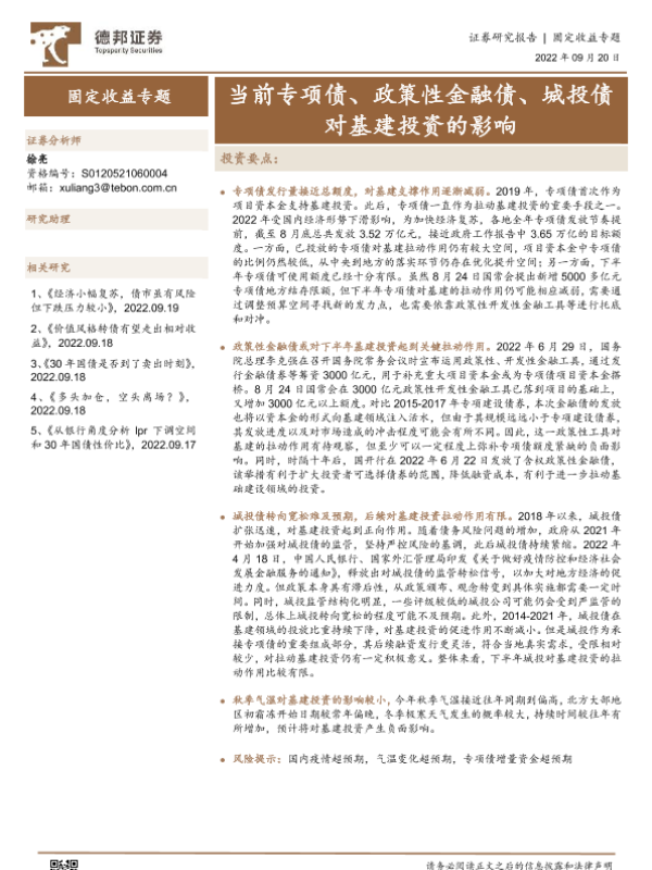 【德邦证券】【20220920】当前专项债、政策性金融债、城投债对基建投资的影响-15页