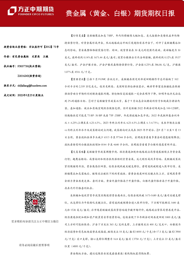 【方正中期期货】【20220923】贵金属(黄金、白银)期货期权日报20220923-23页