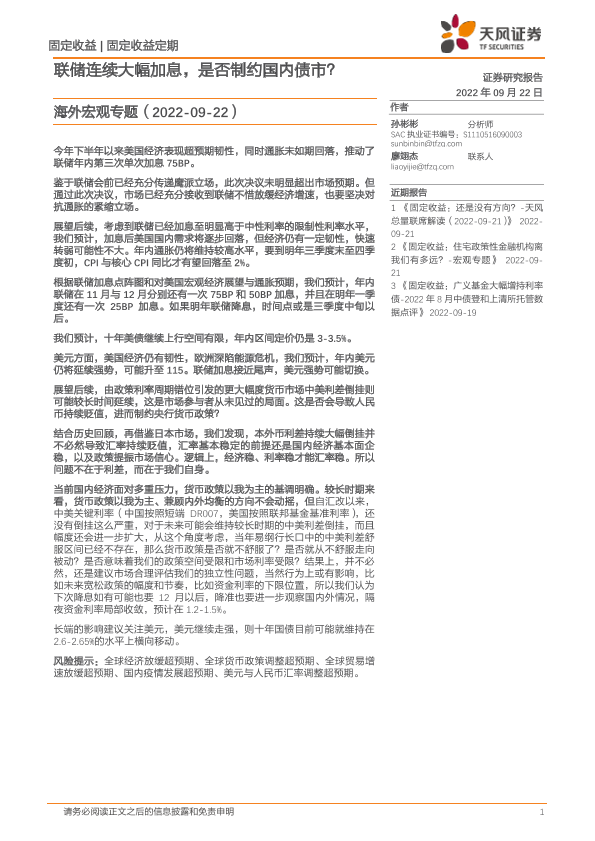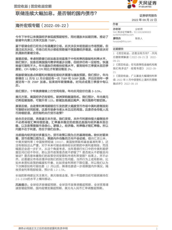【天风证券】【20220922】海外宏观专题:联储连续大幅加息,是否制约国内债市?-15页