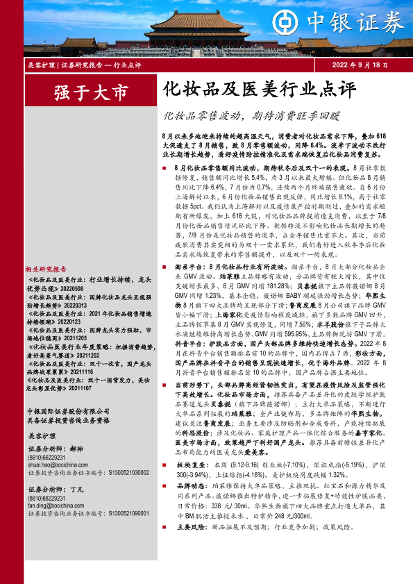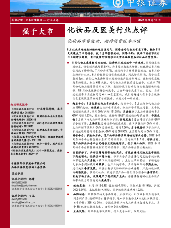 【中银证券】【20220918】化妆品及医美行业点评:化妆品零售波动,期待消费旺季回暖-18页