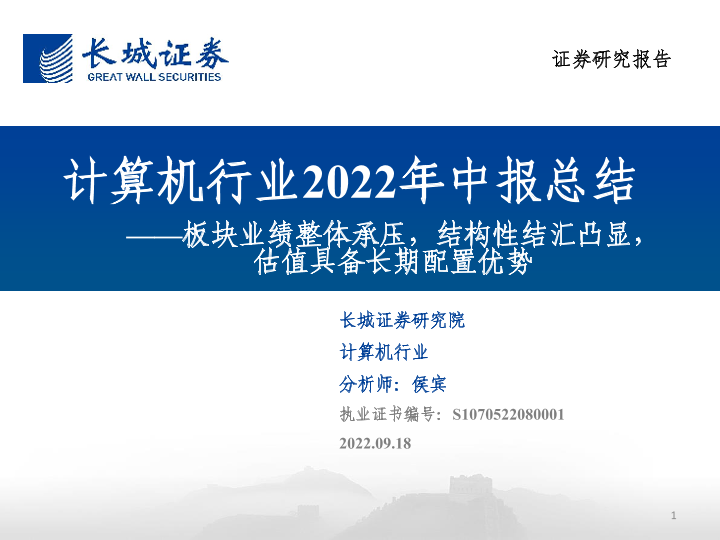 【长城证券】【20220918】计算机行业2022年中报总结:板块业绩整体承压,结构性结汇凸显,估值具备长期配置优势-28页