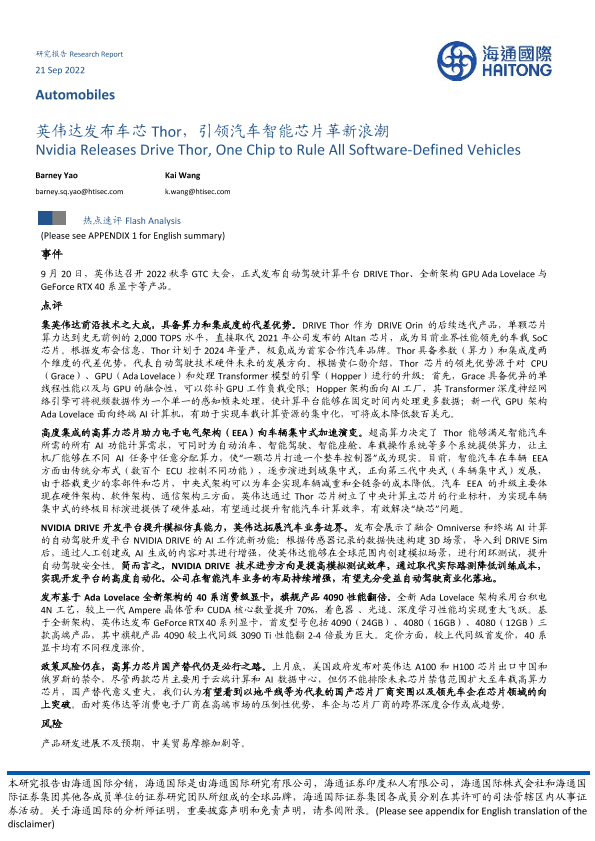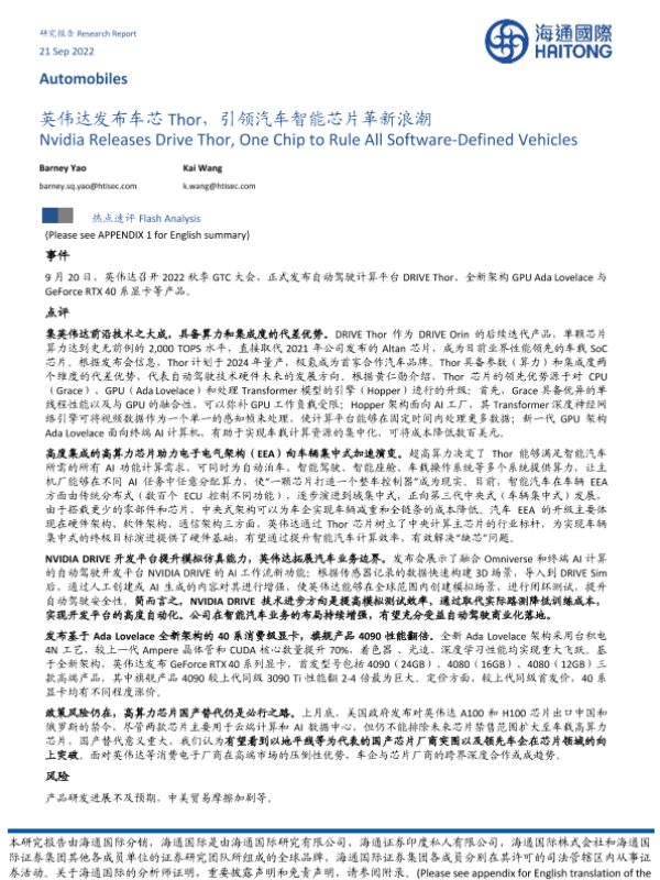 【海通国际】【20220922】英伟达发布车芯 Thor,引领汽车智能芯片革新浪潮-12页