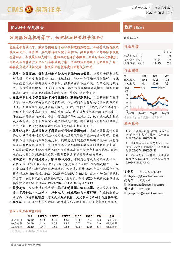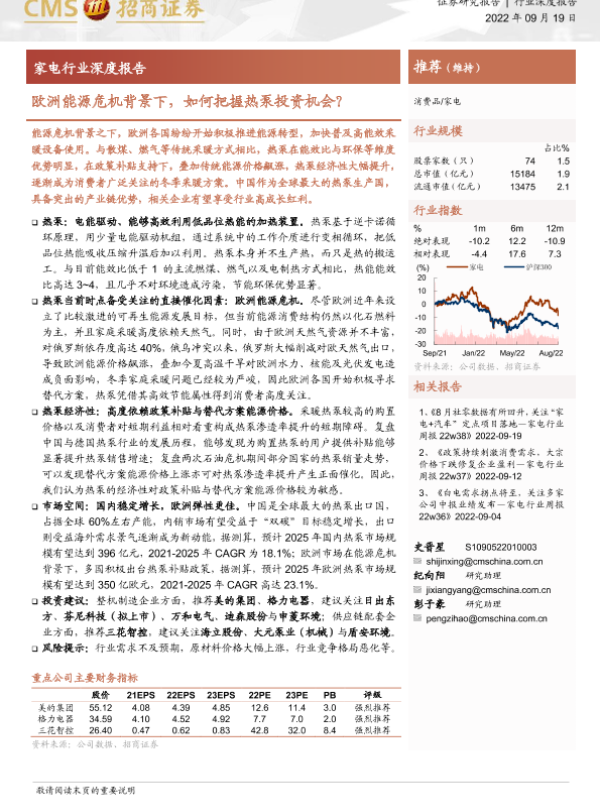 家电行业 投资机会 欧洲市场 热泵 能源危机