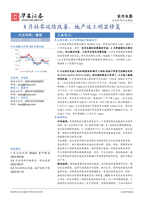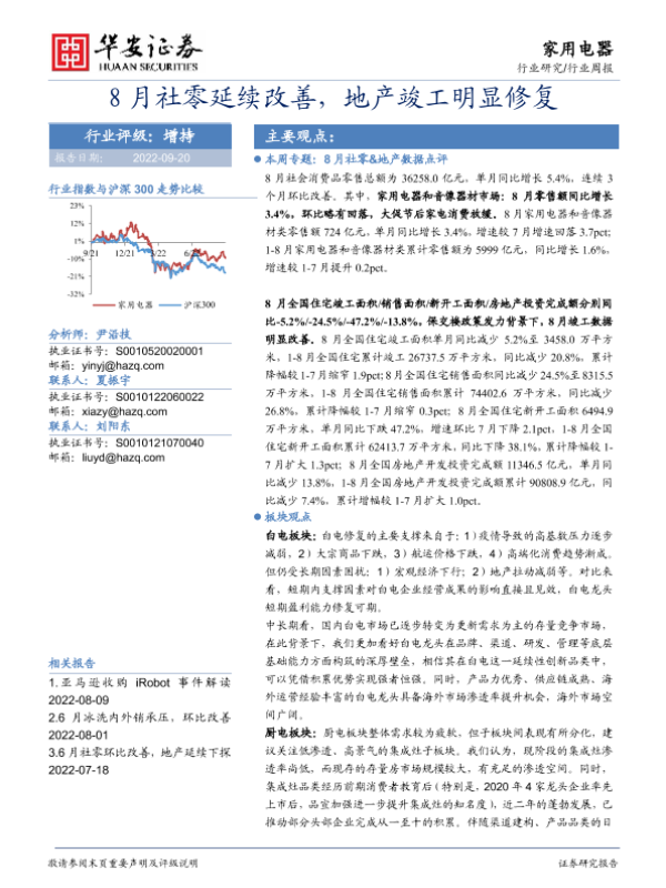 【华安证券】【20220920】家用电器行业周报:8月社零延续改善,地产竣工明显修复-15页
