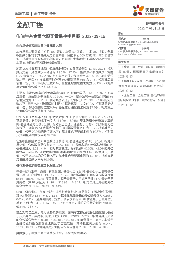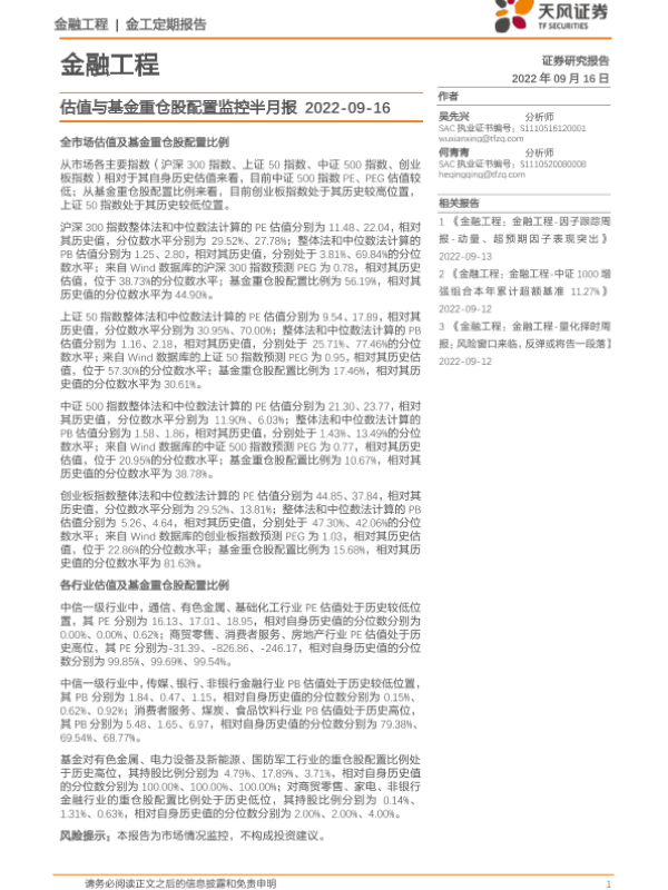 【天风证券】【20220916】金融工程:估值与基金重仓股配置监控半月报-15页