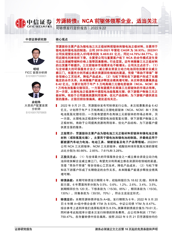 【中信证券】【20220922】可转债发行定价报告:芳源转债,NCA前驱体领军企业,适当关注-17页