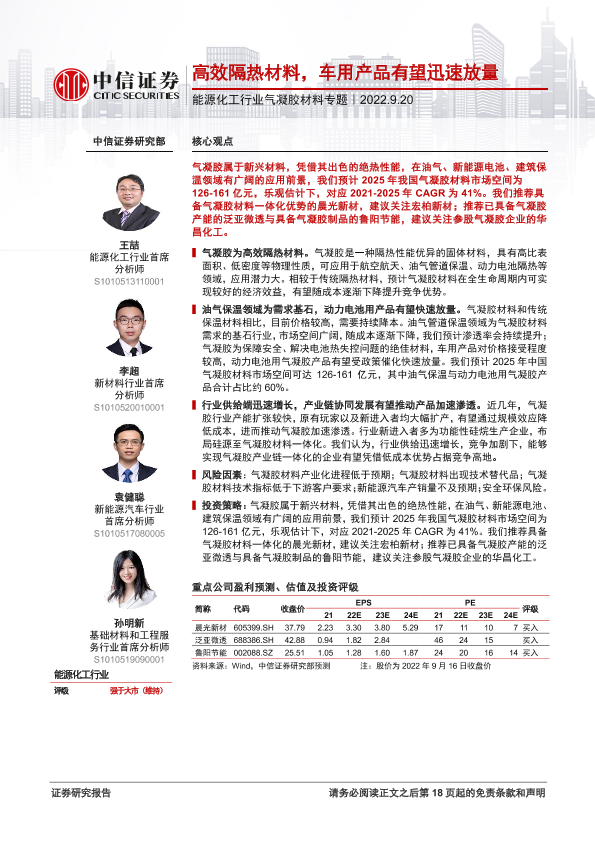 【中信证券】【20220920】能源化工行业气凝胶材料专题:高效隔热材料,车用产品有望迅速放量-19页