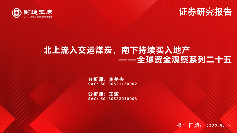 【财通证券】【20220917】全球资金观察系列二十五:北上流入交运煤炭,南下持续买入地产-30页
