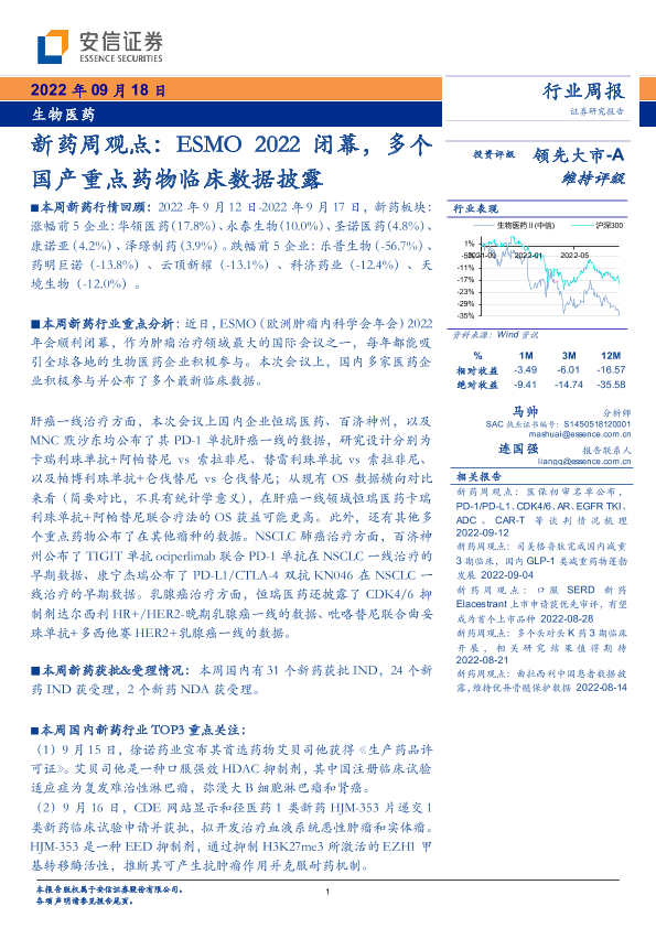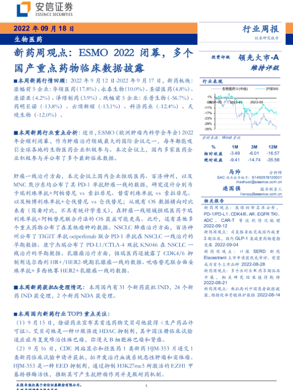 【安信证券】【20220918】生物医药新药周观点:ESMO 2022闭幕,多个国产重点药物临床数据披露-13页