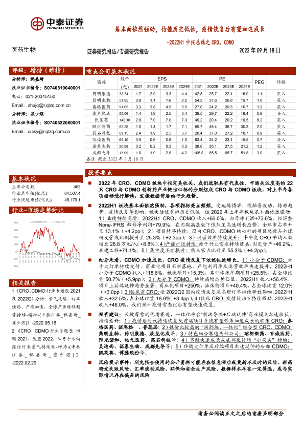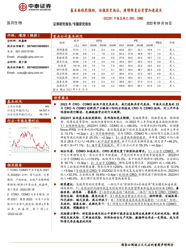【中泰证券】【20220918】医药生物行业2022H1中报总结之CRO、CDMO:基本面依然强劲,估值历史低位,疫情恢复后有望加速成长-25页