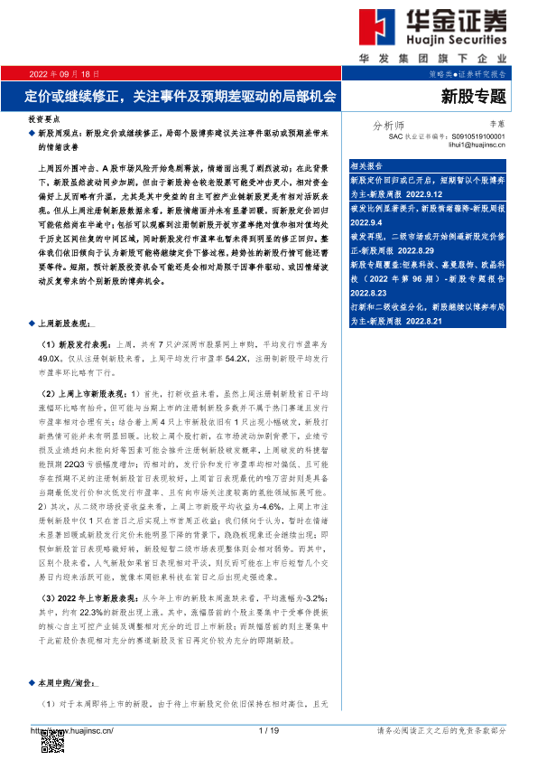 【华金证券】【20220918】新股专题:定价或继续修正,关注事件及预期差驱动的局部机会-19页
