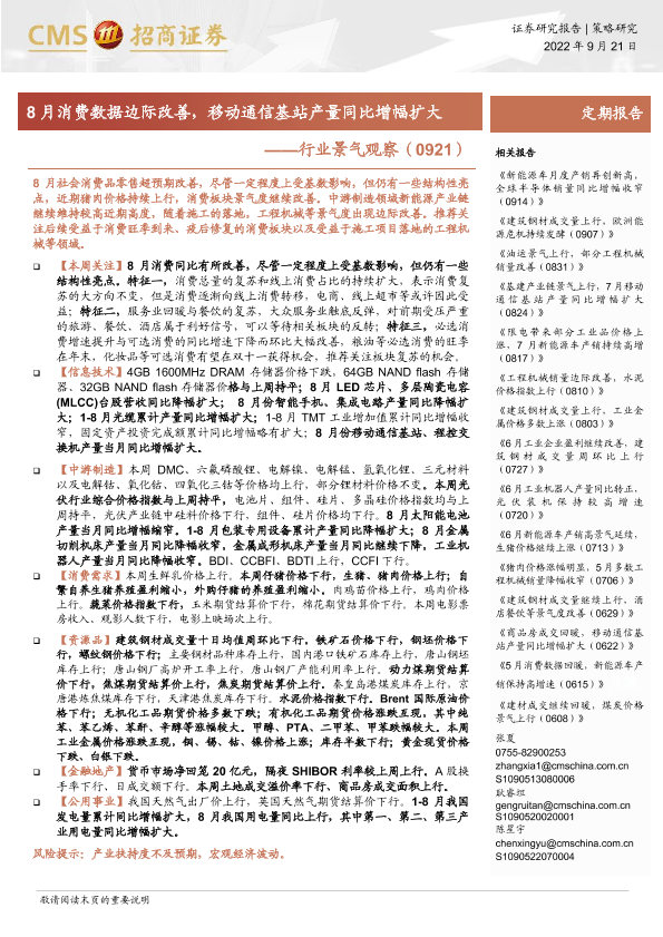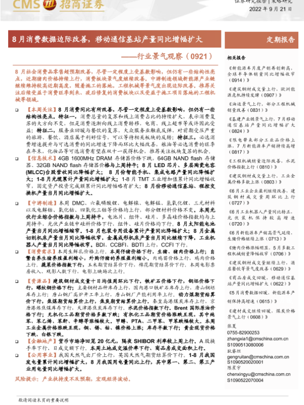 【海通证券】【20220921】行业景气观察:8月消费数据边际改善,移动通信基站产量同比增幅扩大-32页