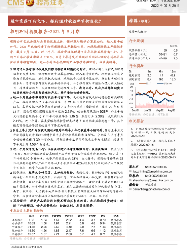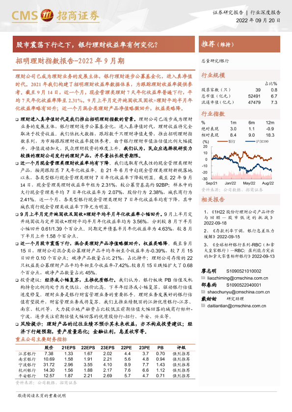 【海通证券】【20220920】银行业招明理财指数报告_2022年9月期:股市震荡下行之下,银行理财收益率有何变化?-19页
