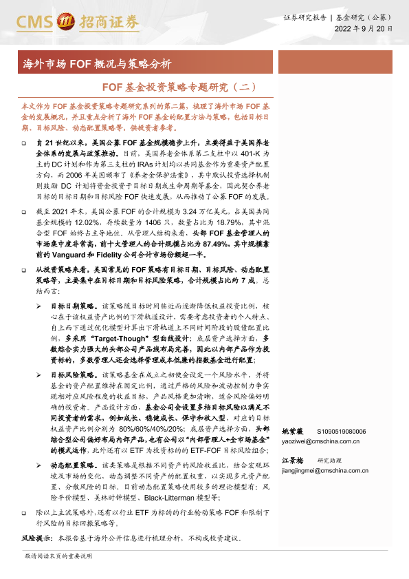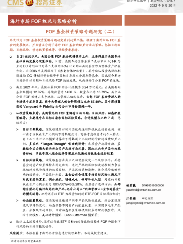 【海通证券】【20220920】FOF基金投资策略专题研究(二):海外市场 FOF 概况与策略分析-20页