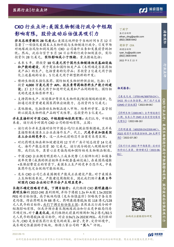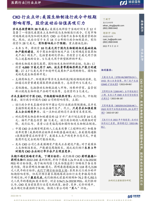 【浦银国际】【20220922】CXO行业点评:美国生物制造行政令中短期影响有限,股价波动后估值具吸引力-13页