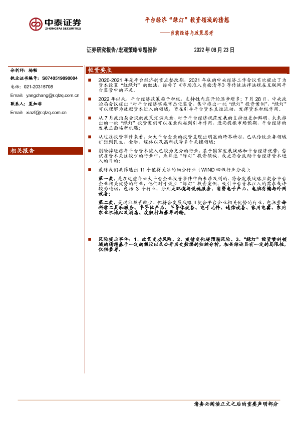 【中泰证券】【20220823】当前经济与政策思考:平台经济“绿灯”投资领域的猜想-15页