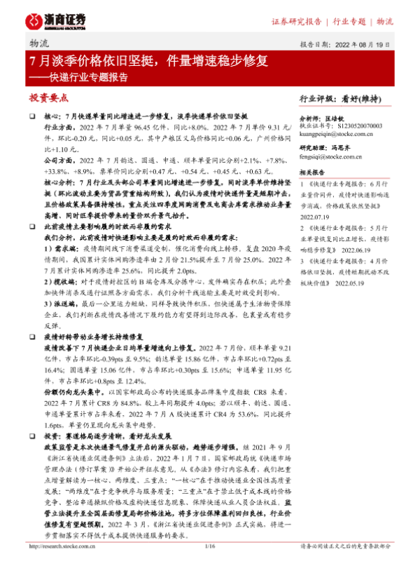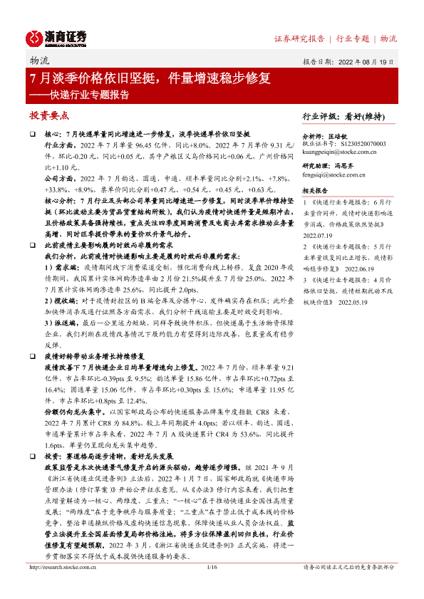 【浙商证券】【20220819】快递行业专题报告:7月淡季价格依旧坚挺,件量增速稳步修复-16页