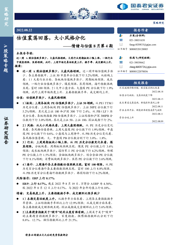 【国泰君安证券】【20220822】情绪与估值8月第4期:估值震荡回落,大小风格分化-18页