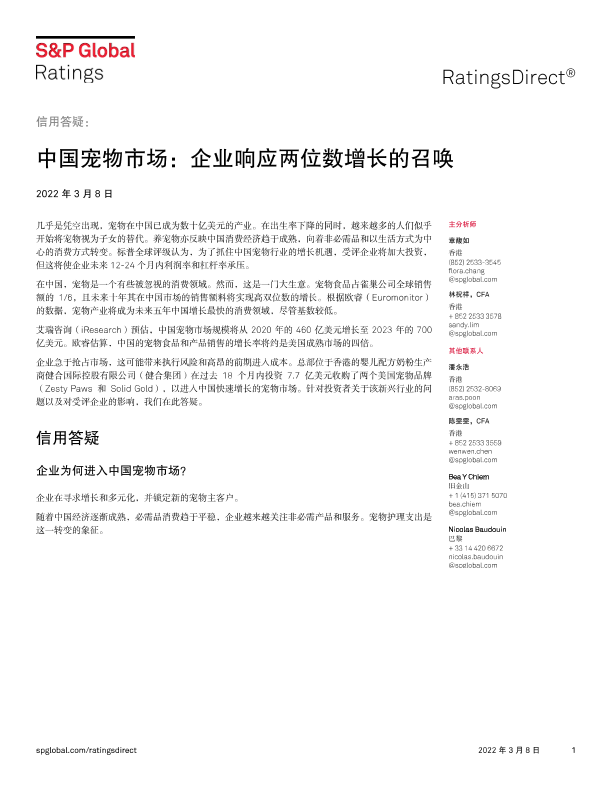 【标普全球评级】【20220308】中国宠物市场:企业响应两位数增长的召唤-7页