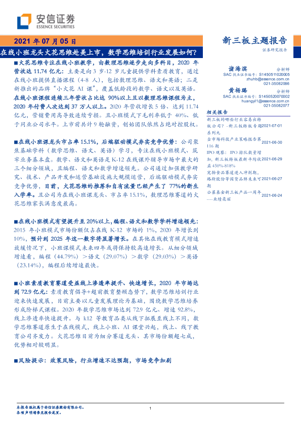 【安信证券】【20210705】新三板主题报告:在线小班龙头火花思维赴美上市,数学思维培训行业发展如何?-20页