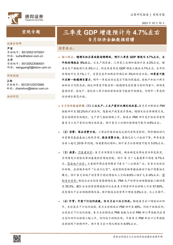 【德邦证券】【20231010】9月经济金融数据前瞻:三季度GDP增速预计为4.7%左右-17页