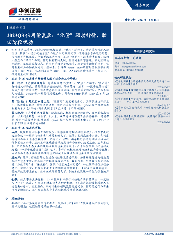 【华创证券】【20231016】【债券分析】2023Q3信用债复盘:“化债”驱动行情,赎回阶段扰动-23页