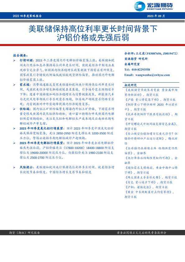 【宏源期货】【202309】2023四季度策略报告:美联储保持高位利率更长时间背景下沪铝价格或先强后弱-22页