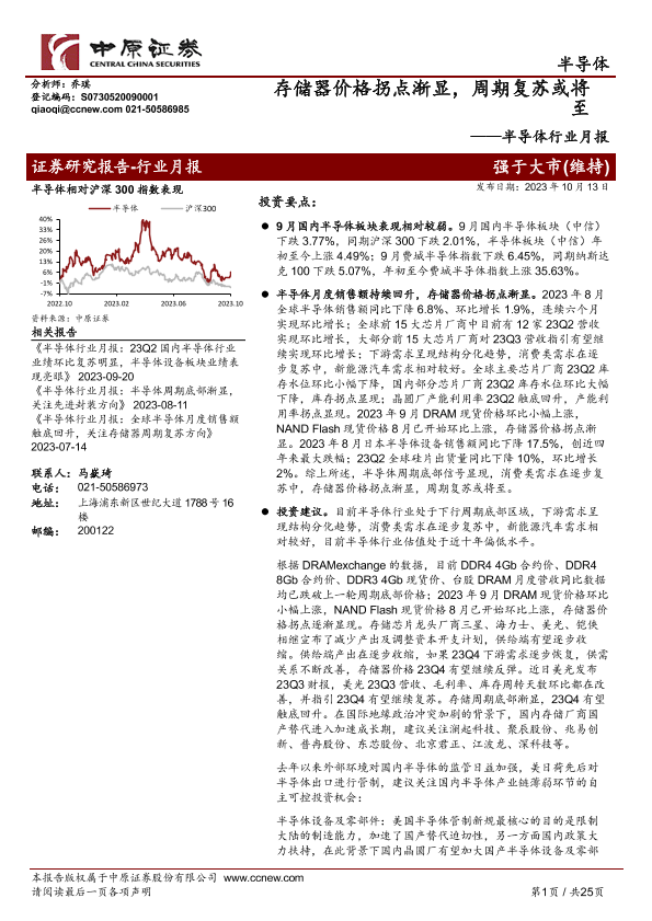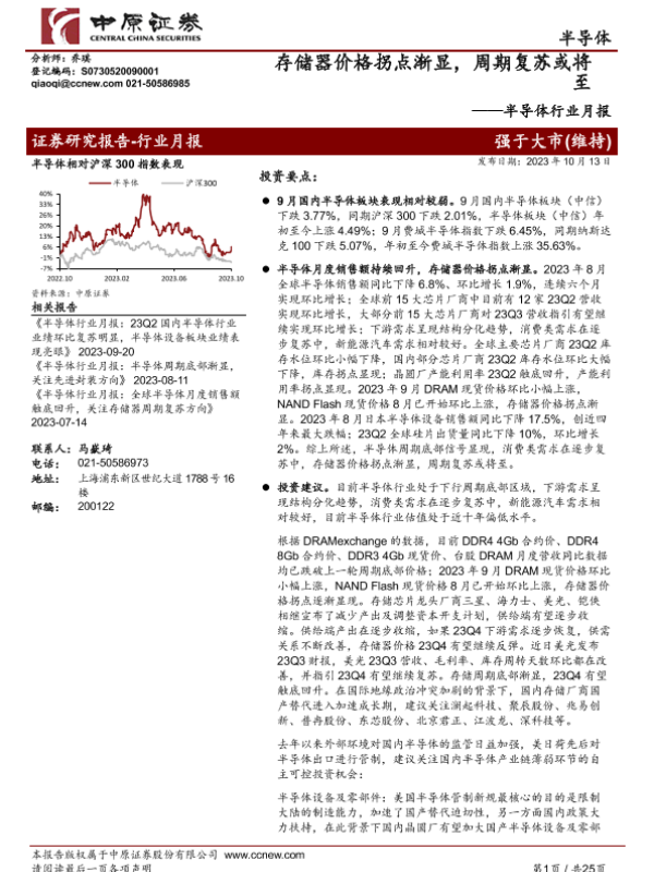 【中原证券】【20231013】半导体行业月报:存储器价格拐点渐显,周期复苏或将至-25页