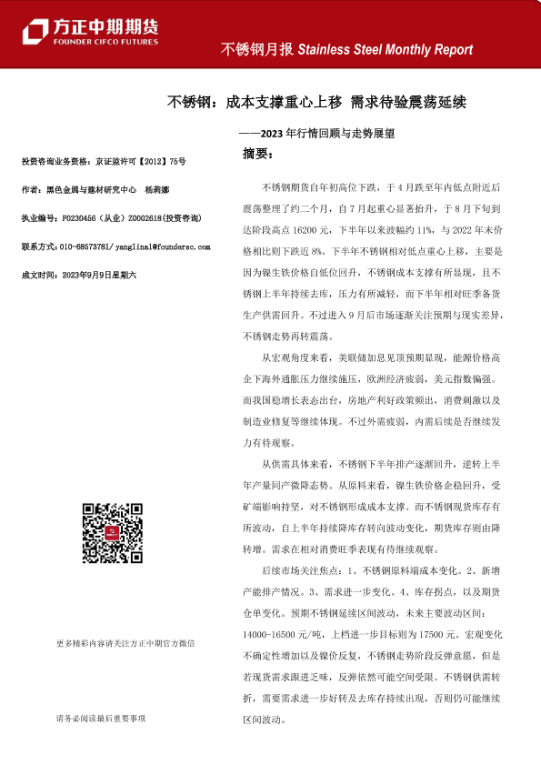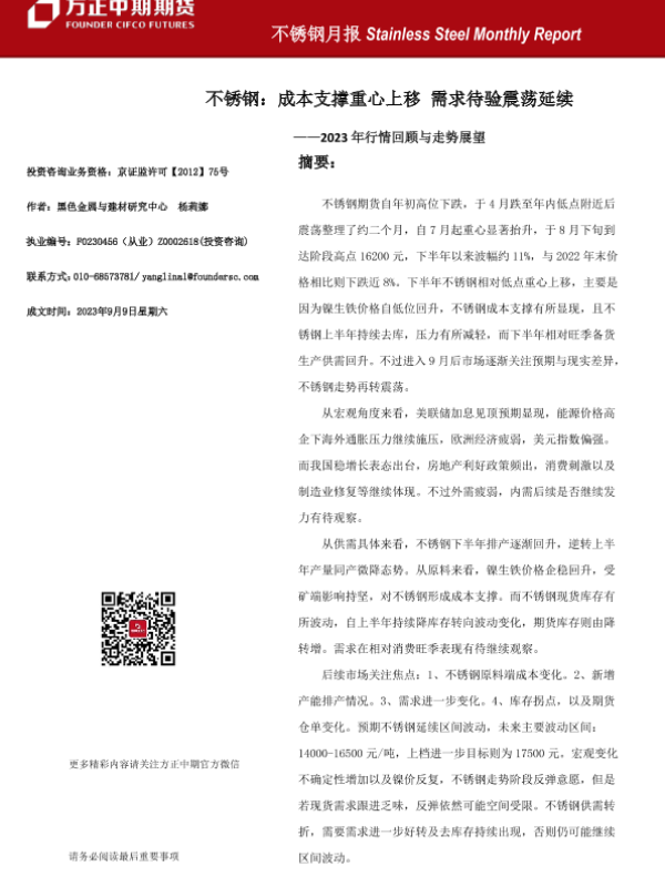 【方正中期期货】【20230909】不锈钢月报:2023年行情回顾与走势展望,不锈钢,成本支撑重心上移,需求待验震荡延续-23页