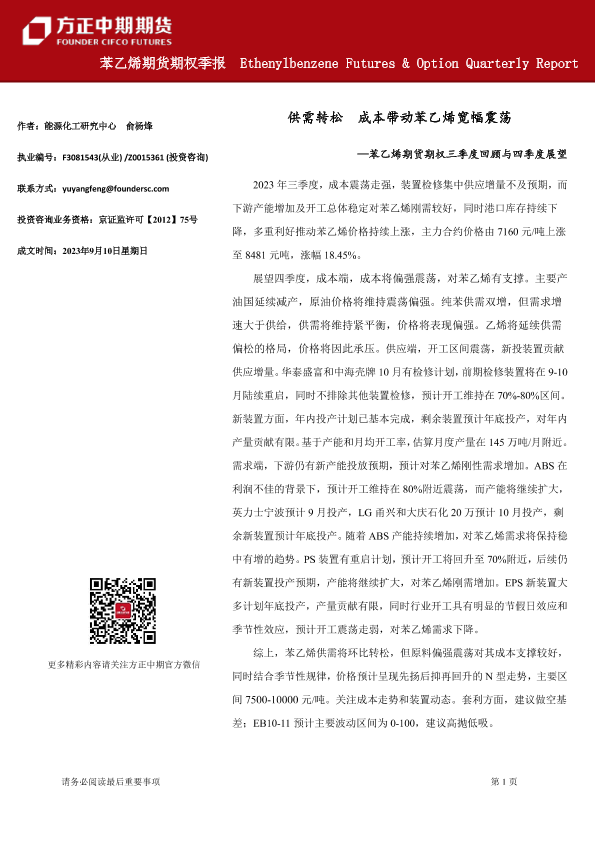 【方正中期期货】【20230910】苯乙烯期货期权三季度回顾与四季度展望:供需转松,成本带动苯乙烯宽幅震荡-25页