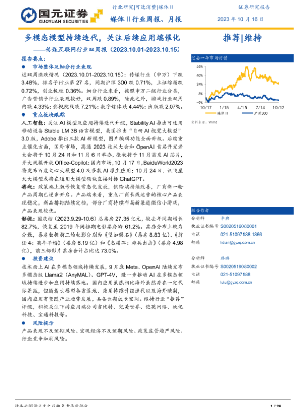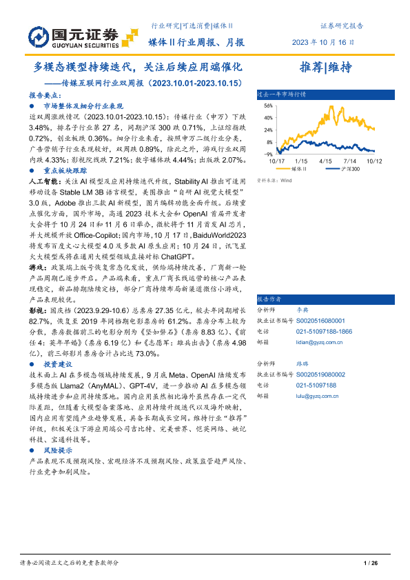 【国元证券】【20231016】传媒互联网行业双周报:多模态模型持续迭代,关注后续应用端催化-26页