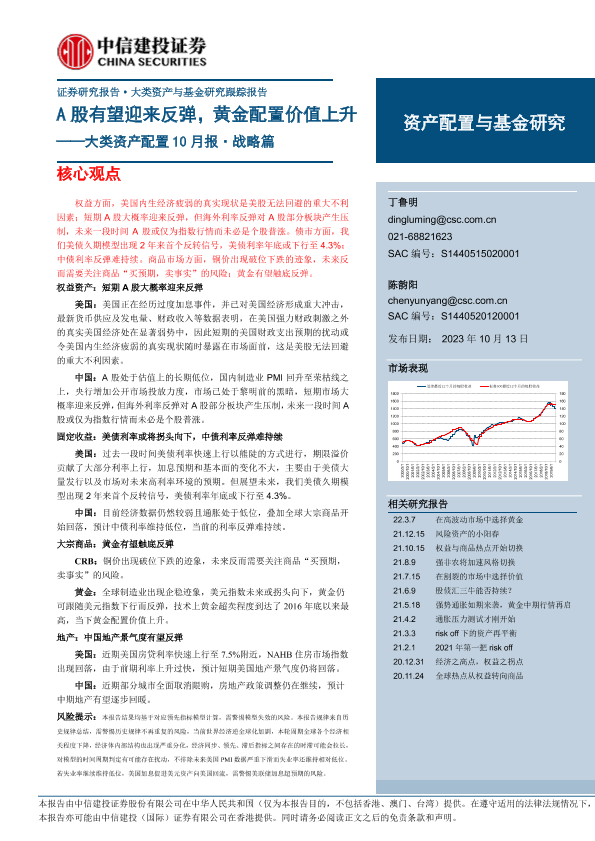 【中信建投证券】【20231013】大类资产配置10月报·战略篇:A股有望迎来反弹,黄金配置价值上升-23页