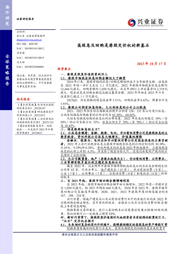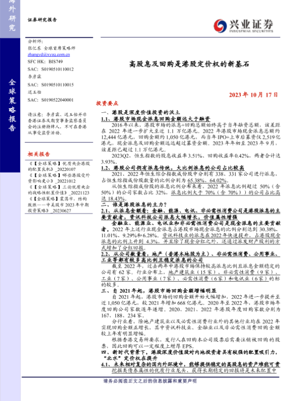 【兴业证券】【20231017】高股息及回购是港股定价权的新基石-23页